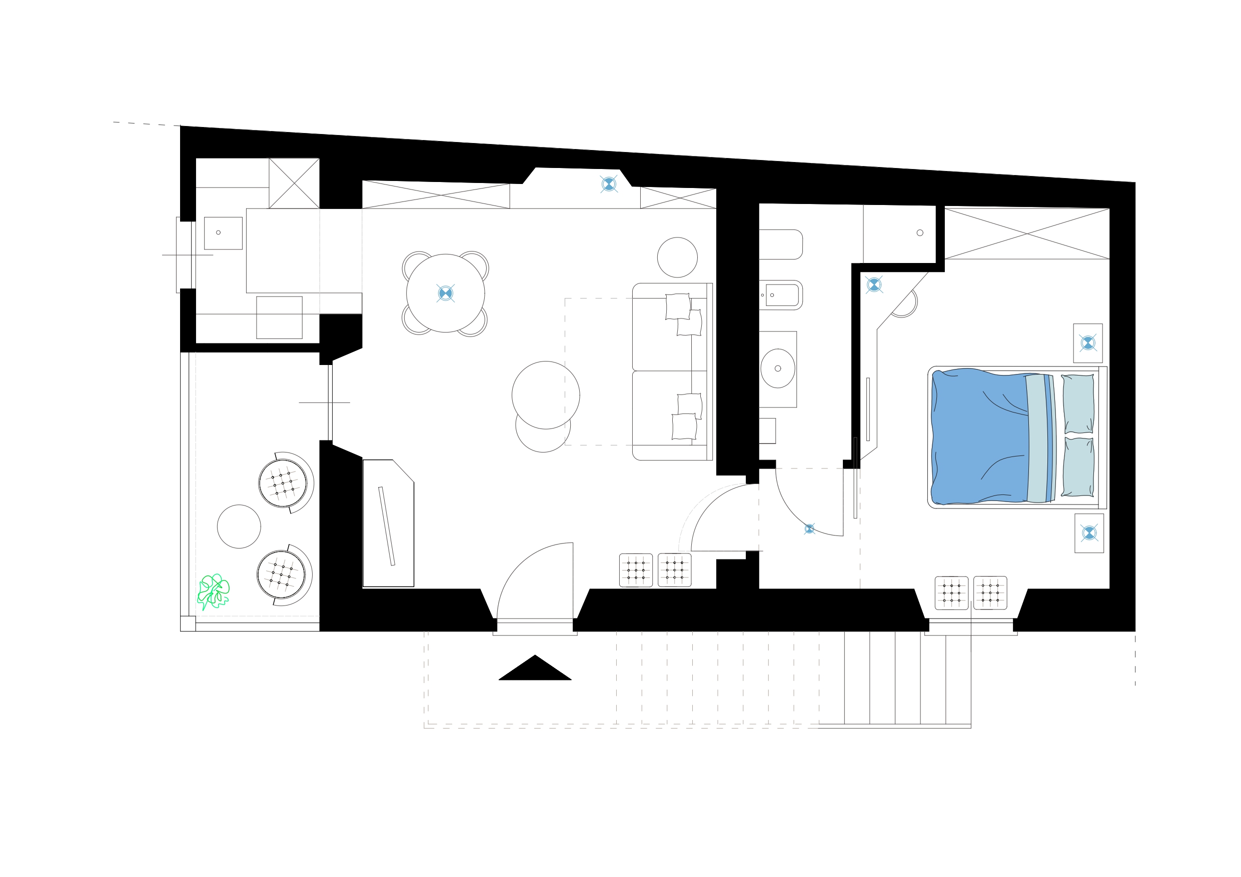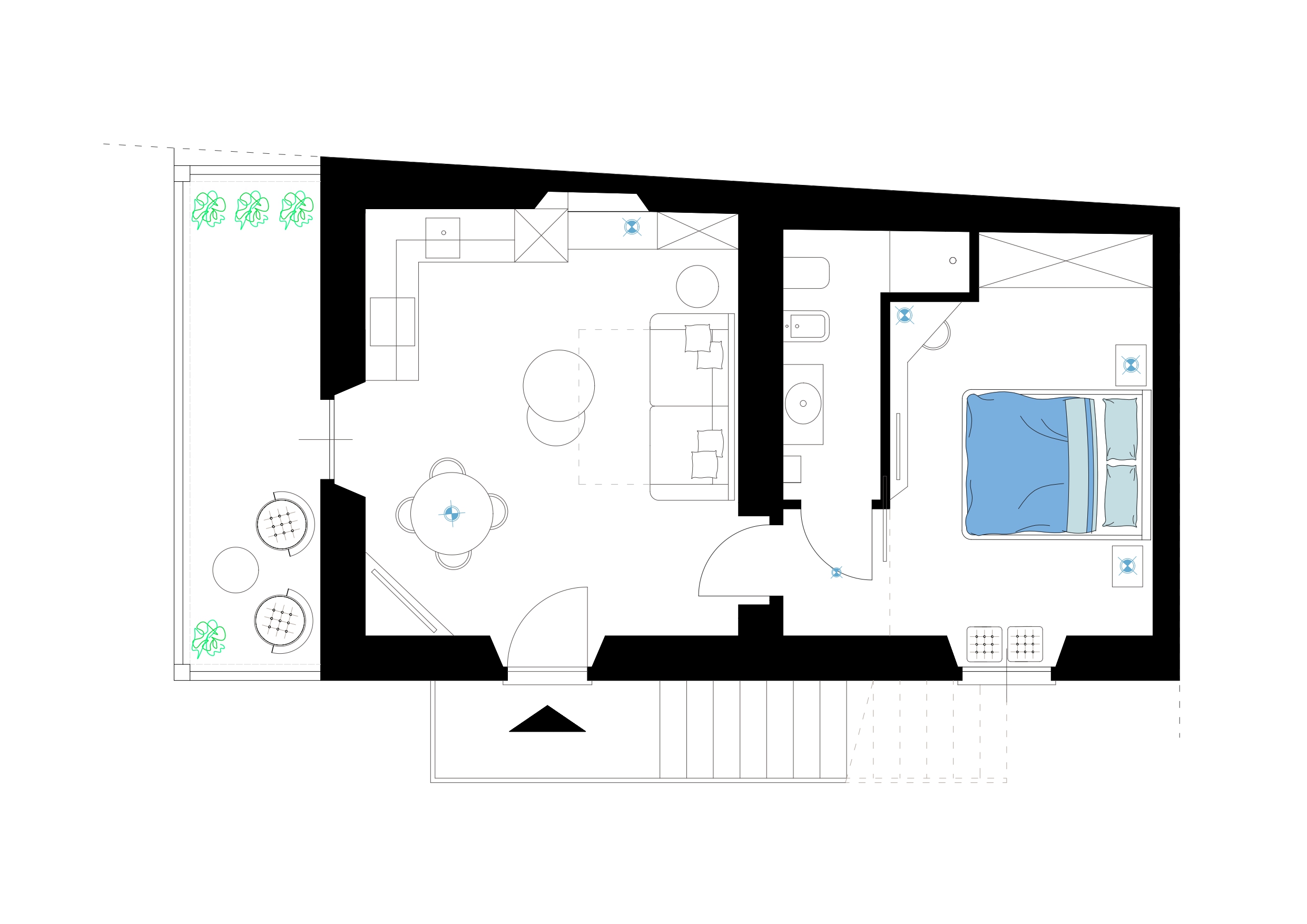 - Piano terra: ingresso, zona pranzo, cucinotto, balcone, ampia camera matrimoniale e bagno.
