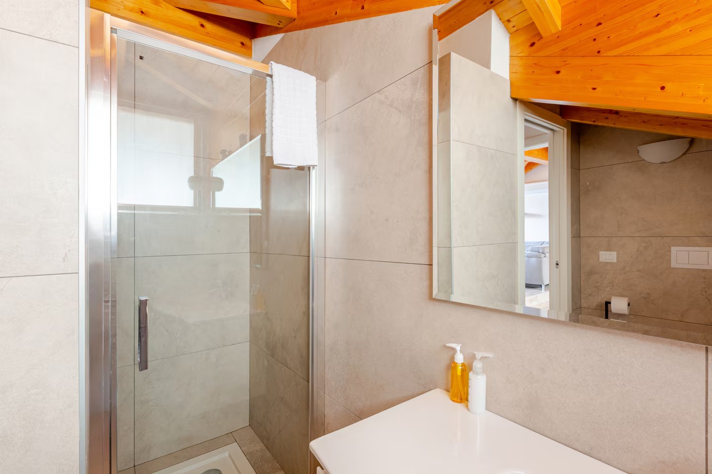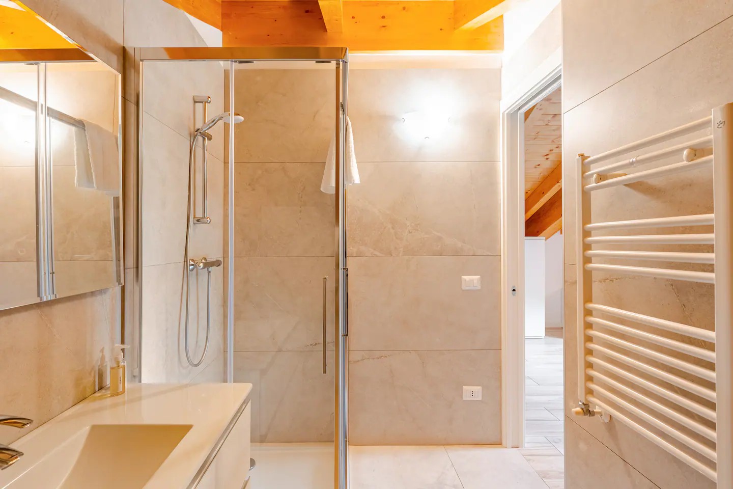 L’appartamento, disposto su un unico livello, si trova al quarto e ultimo piano, servito da ascensore, e si sviluppa in una ampia e luminosa zona living con soggiorno e cucina a vista, due bagni con doccia e due camere da letto, di cui una matrimoniale e una con letti singoli.