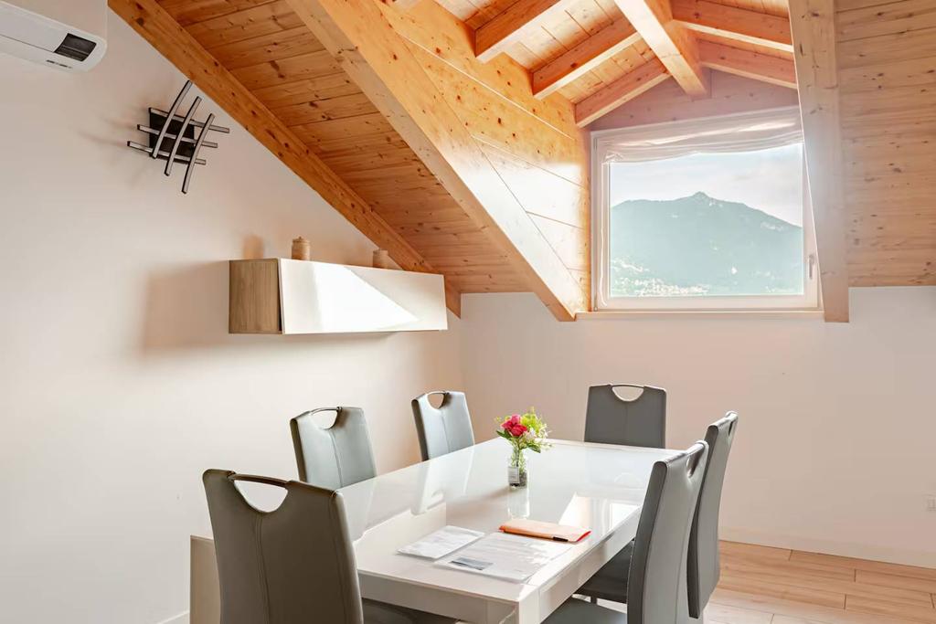 Le ampie finestre regalano una splendida vista lago e assicurano grande luminosità naturale, creando un’atmosfera calda ed elegante.