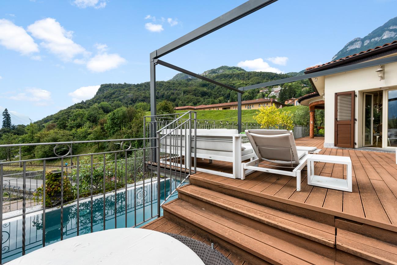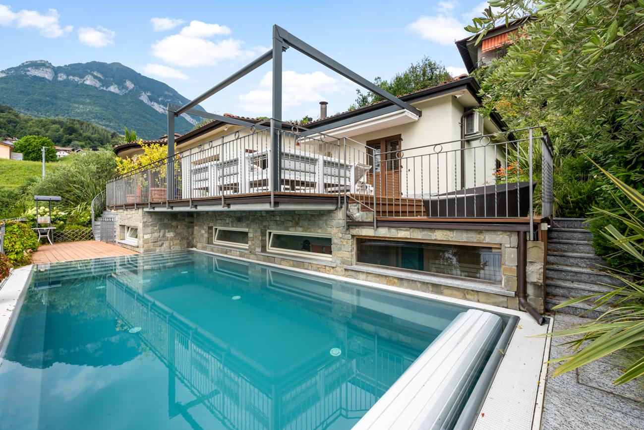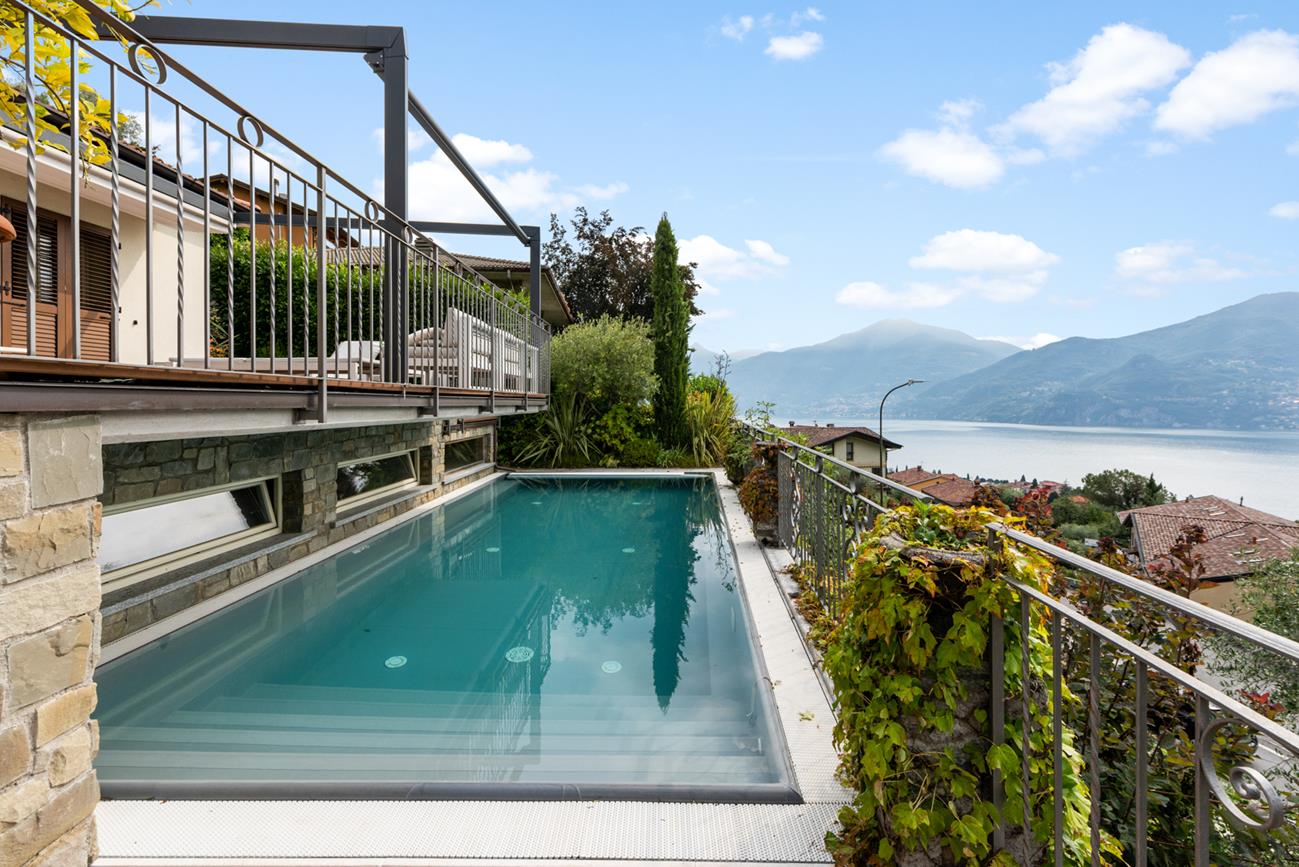 Tutti gli ambienti principali godono di accesso diretto all’ampio solarium con piscina e vista lago.