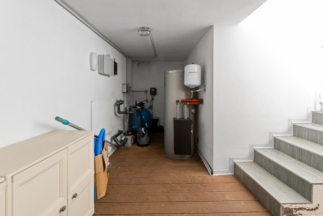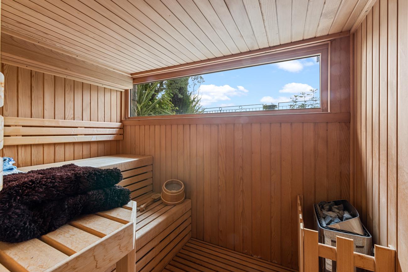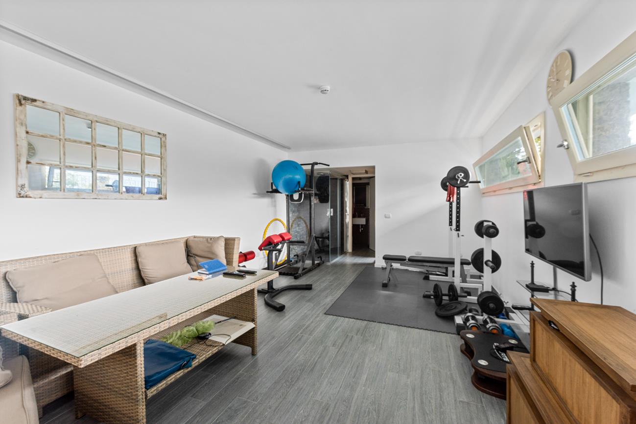 Una scala esterna conduce al piano inferiore, dove troviamo una zona dedicata al benessere con locale fitness e sauna.