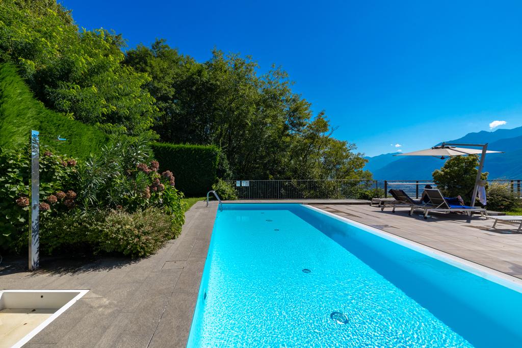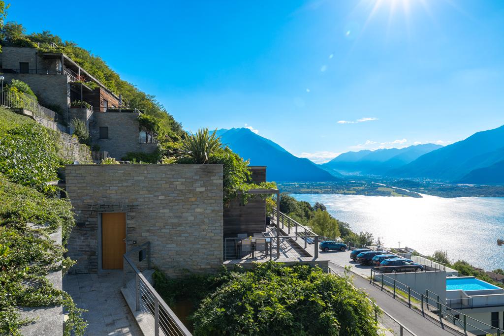 Il solarium e la piscina, parti comuni del complesso, sono posizionati sulla copertura, offrendo una vista mozzafiato sul lago e sulle montagne.