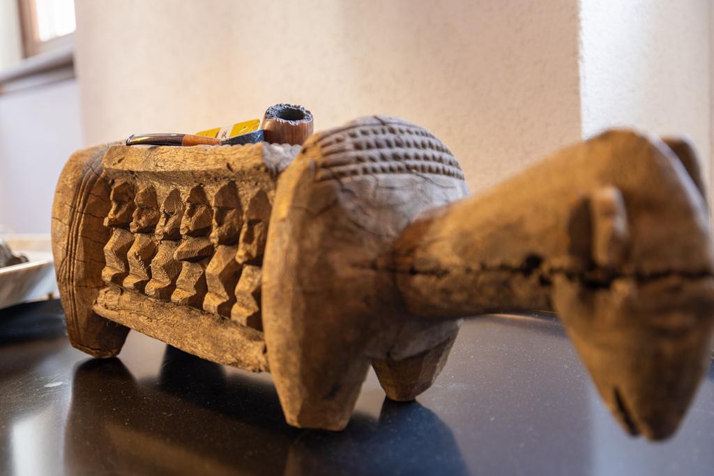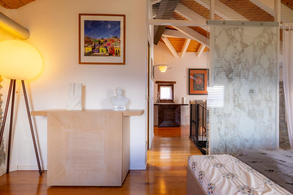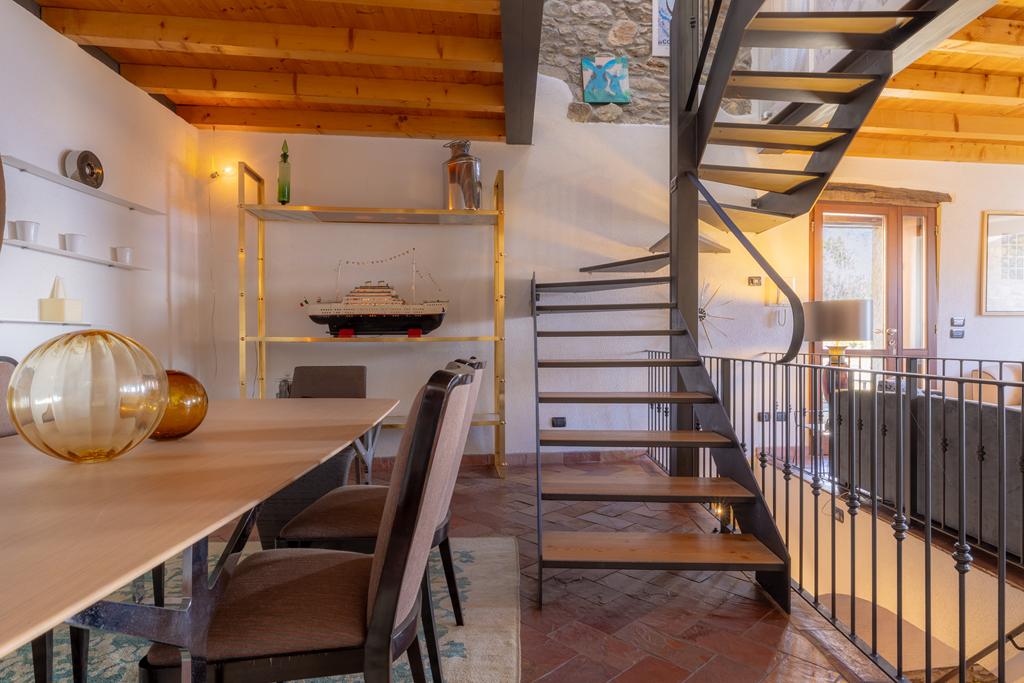 Attraverso un’elegante scala di design in ferro si accede infine alla zona notte, caratterizzata da calde travi in legno a vista, composta da due camere da letto e un bagno.