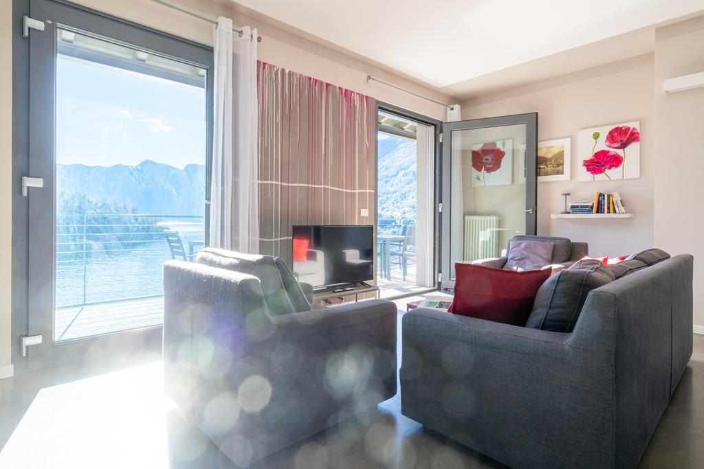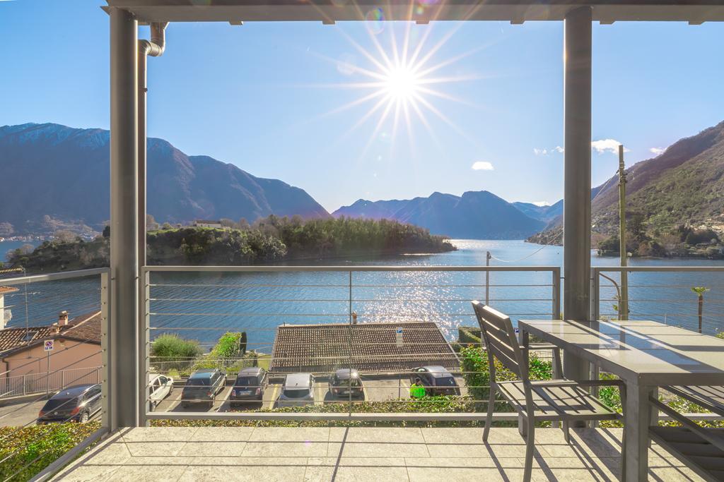 * Luminoso soggiorno con grandi vetrate affacciate sul lago e sull’Isola Comacina