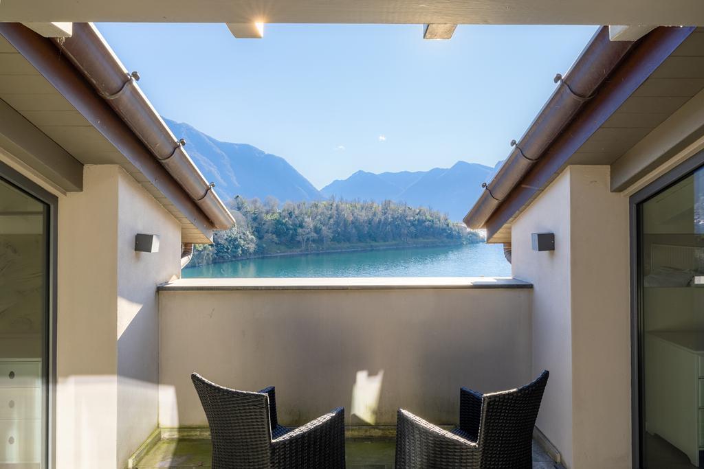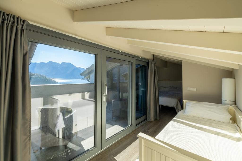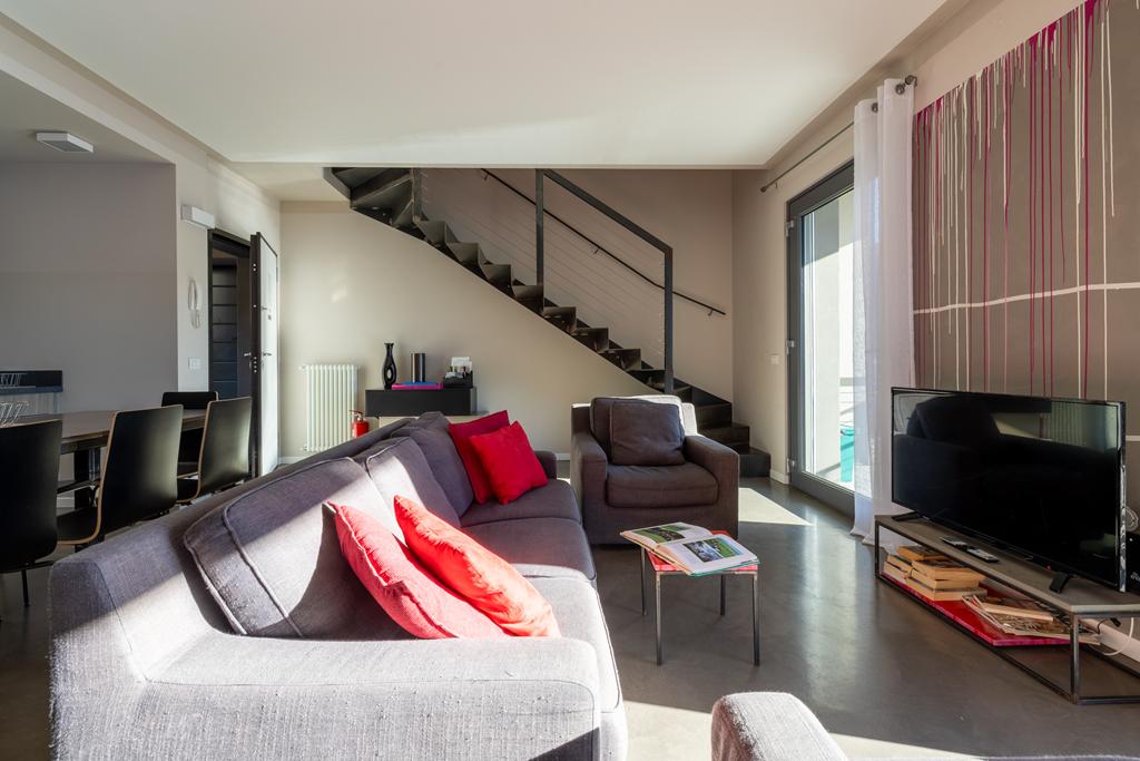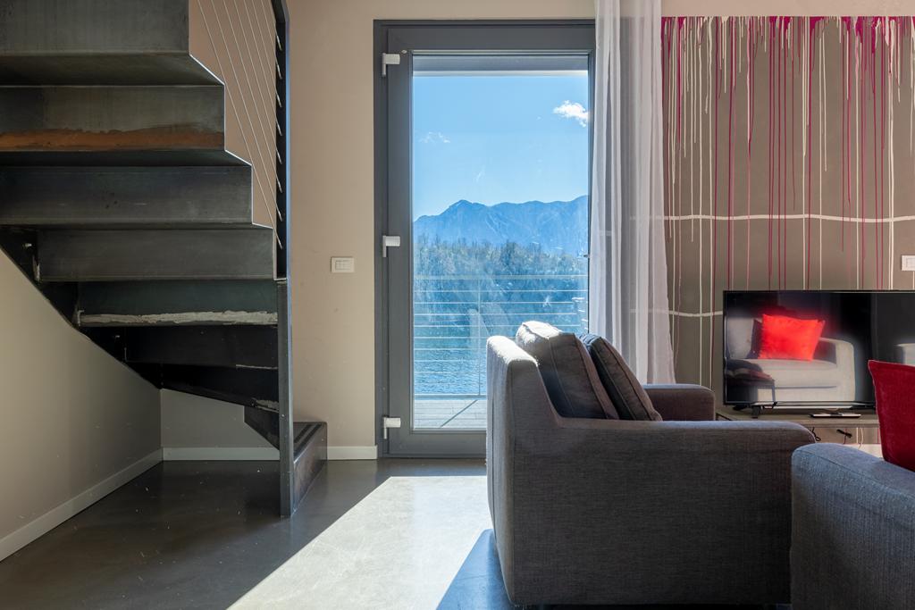 L’appartamento, di circa 120 mq, si sviluppa su due livelli e conquista fin dal primo sguardo per le sue ampie vetrate che incorniciano il lago come un quadro naturale in continua evoluzione.