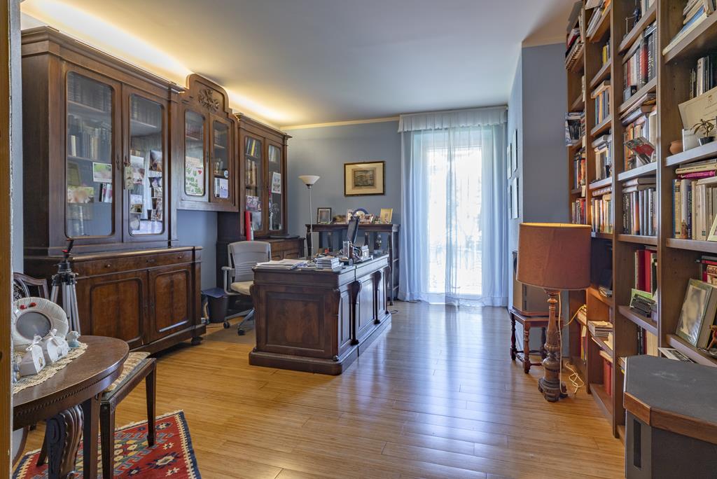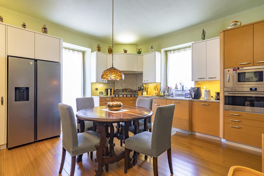 La zona living comprende anche una suggestiva sala da tè, perfetta per accogliere ospiti in un ambiente intimo ed elegante, una grande sala da pranzo con camino e una cucina moderna completamente attrezzata, anch’essa arricchita da un affascinante camino. Il piano è completato da un bagno di servizio.