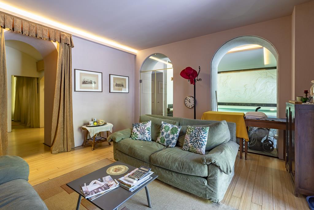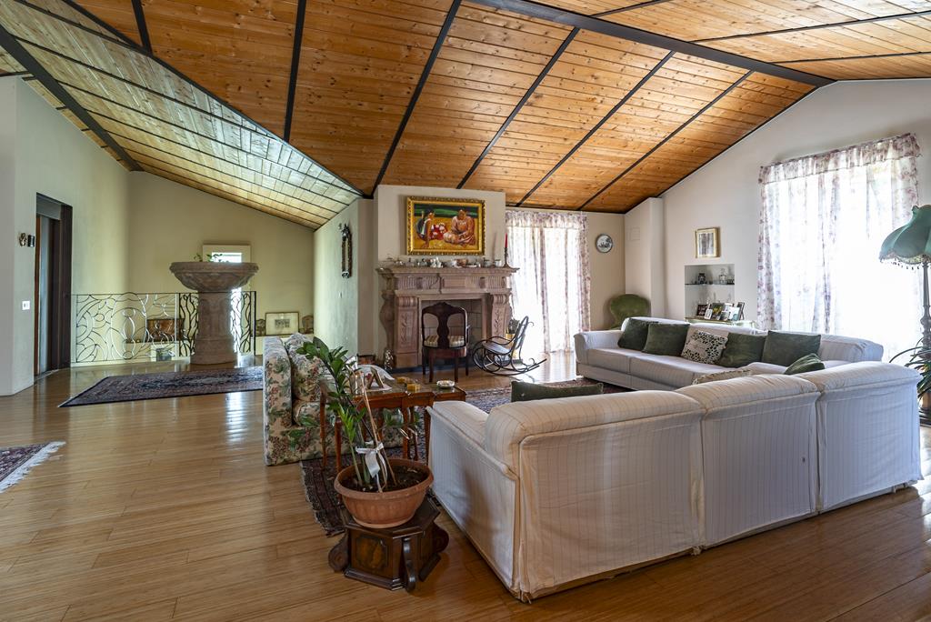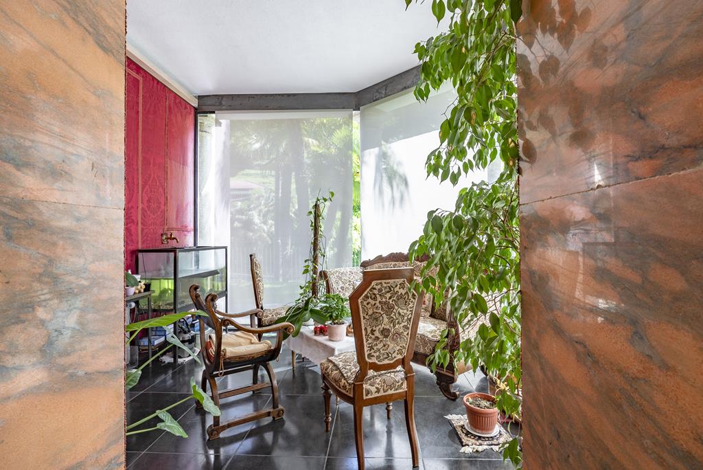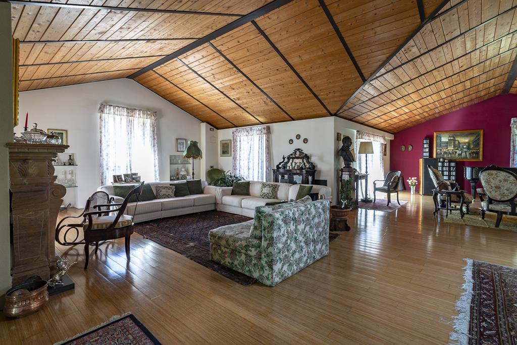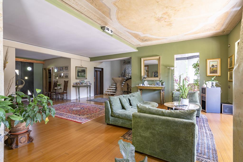 L’ingresso alla villa principale è caratterizzato da un portone di design contemporaneo, che introduce immediatamente agli ambienti raffinati della residenza. Il piano terra si apre su uno spettacolare doppio soggiorno con soffitti alti e affreschi dei primi del ’900 perfettamente restaurati, impreziosito da ampie vetrate con vista sul giardino.
