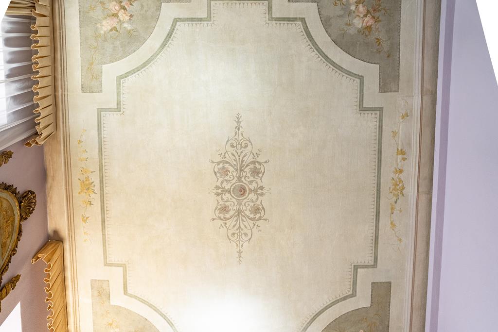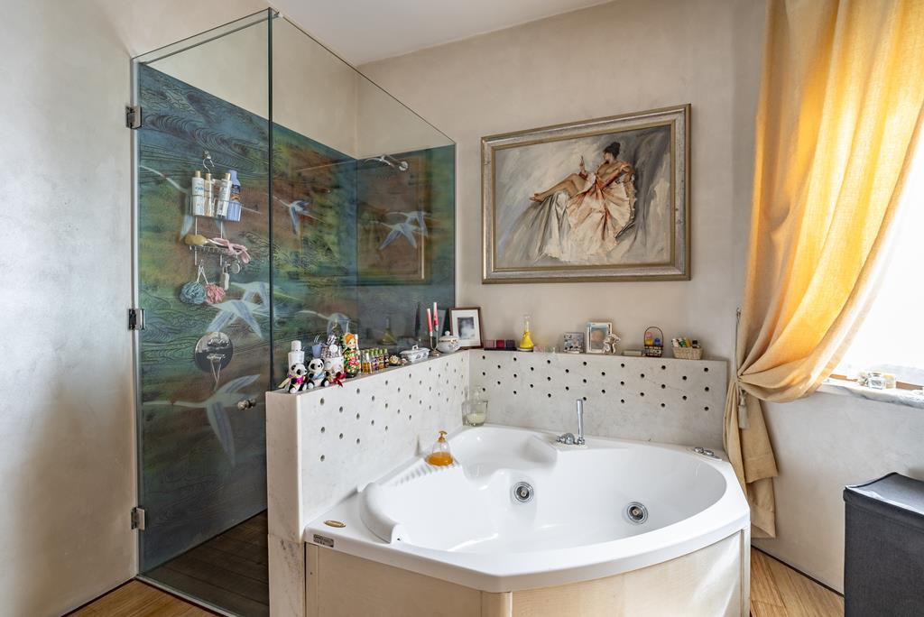 La suite padronale rappresenta uno degli ambienti più affascinanti della casa. Decorata con affreschi storici restaurati, dispone di bagno privato con vasca idromassaggio e doccia, accesso a un balcone con vista sul giardino e scorci del lago, e un camino all’interno della camera, che crea un’atmosfera calda e raffinata.
